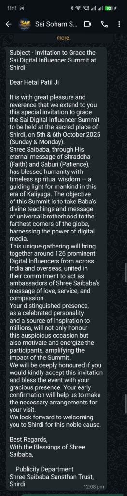 Reading the message, my hands trembled slightly. It felt surreal. Baba had indeed called me, just as my heart had quietly believed He would. I was officially invited to attend the Shree Sai Social Media Summit 2025 in Shirdi.
